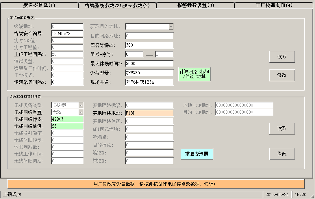 此頁面主要設置變送器的采集,上傳間隔,間隔時間,ZIGBEE網(wǎng)絡的網(wǎng)絡號,信道號,以及現(xiàn)場井名,還有根據(jù)井名稱生成網(wǎng)絡參數(shù)。所有參數(shù)設置完須執(zhí)行寫入操作,寫入操作完畢之后須用戶保存參數(shù)。網(wǎng)絡參數(shù)設置完須重啟變送器才可以啟用本次設定的無線參數(shù)。