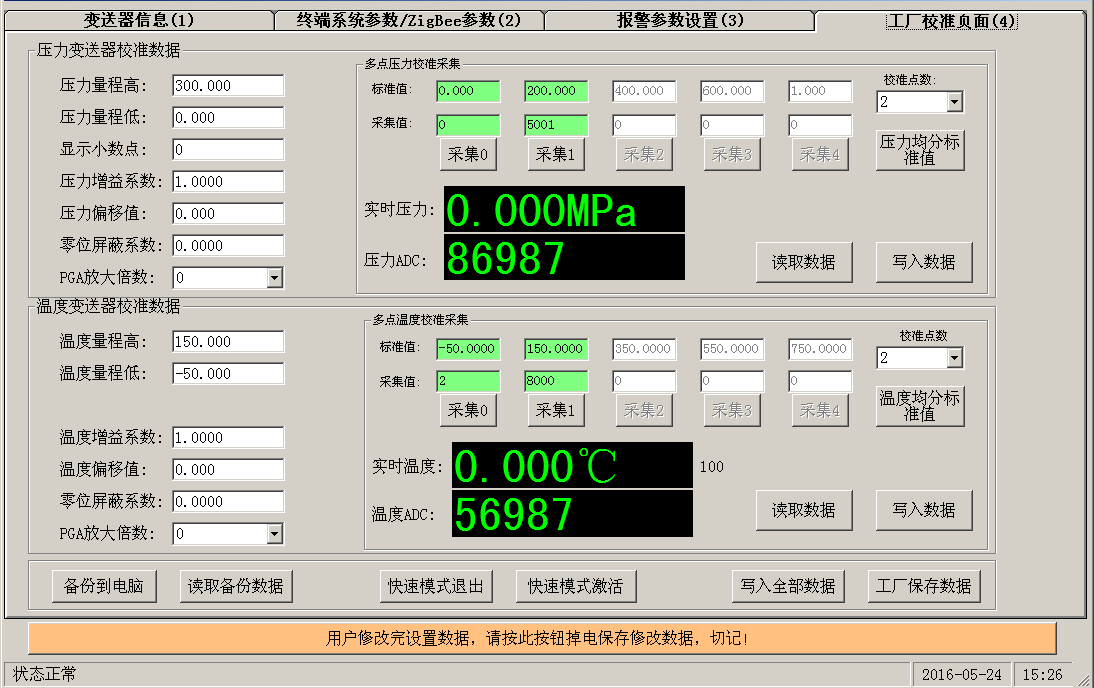 工廠校準頁面主要是溫度和壓力的校準數(shù)據(jù),此為工廠數(shù)據(jù)。工廠數(shù)據(jù)參數(shù)意義以及設置詳細情況咨詢常州天利,這里不做太多解釋。需要特別說明的是本公司采用多點數(shù)據(jù)擬合算法,保證壓力和溫度傳感器的數(shù)據(jù)準確性。可以根據(jù)變送器的類型,選擇校準溫度還是壓力通道。工廠數(shù)據(jù)采集完畢需要寫入操作,然后需要執(zhí)行工廠保存操作數(shù)據(jù)才會被保存在變送器內部。